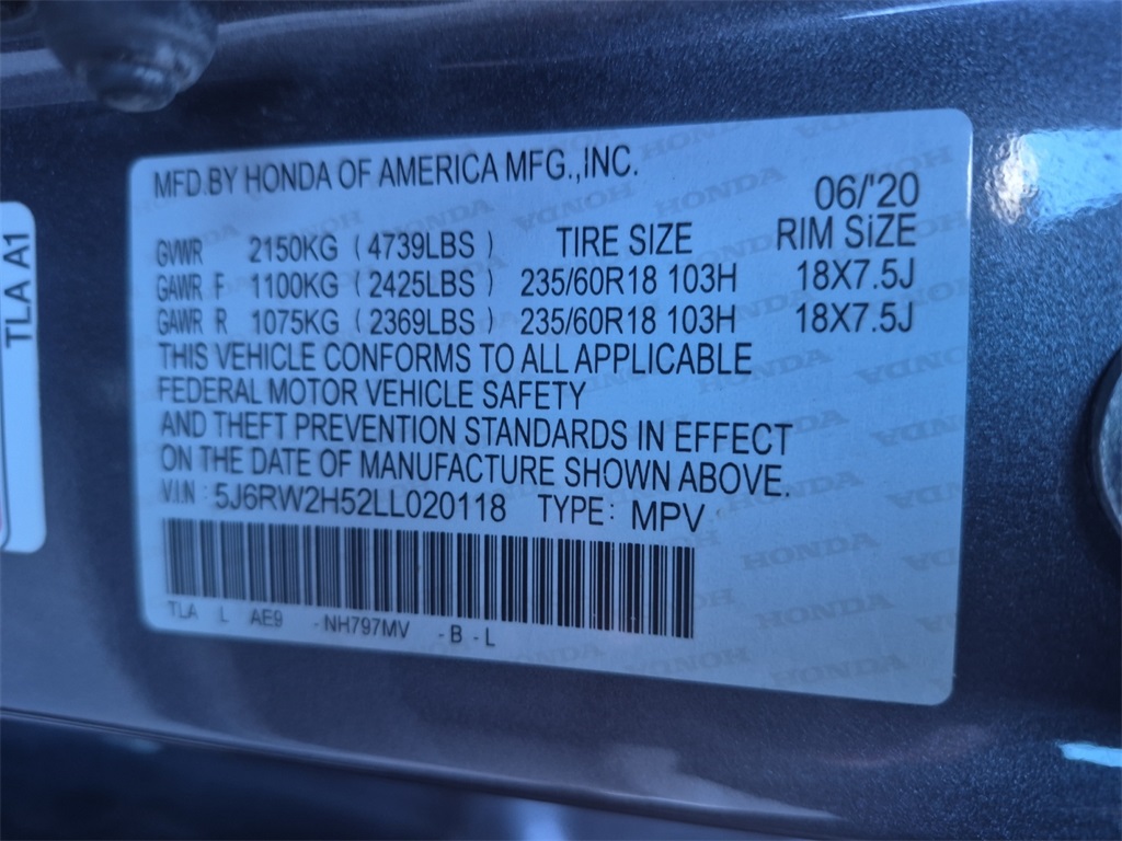 - VIN : 5J6RW2H52LL020118