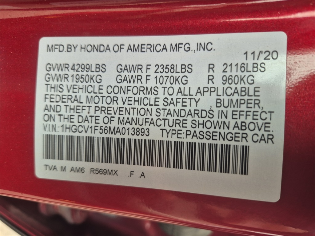 - VIN : 1HGCV1F56MA013893