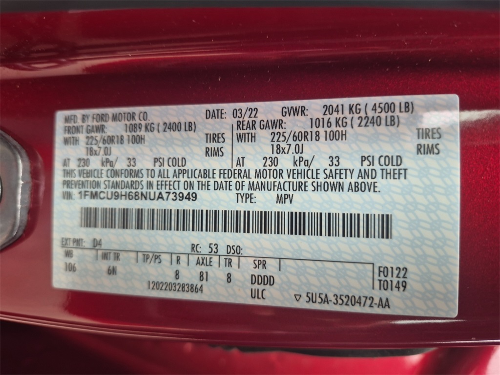 - VIN : 1FMCU9H68NUA73949